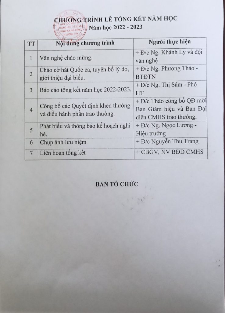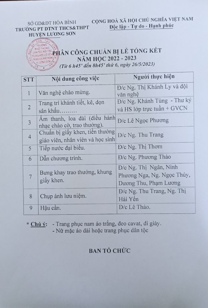 Kế hoạch hoạt động chuyên biệt Chương trình và Phân công chuẩn bị cho lễ tổng kết năm học 2022-2023 Posted on 24/05/2023 by admin Bài viết liên quan Tổ khoa học tự nhiên và tổ khoa học xã hội tổ chức sinh hoạt chuyên đề theo hướng “Nghiên cứu bài học” HỘI NGHỊ CÁN BỘ VIÊN CHỨC Trường PT DTNT THCS&THPT huyện Lương Sơn năm học 2024 – 2025 LỄ KẾT NẠP ĐẢNG VIÊN MỚI Lễ tổng kết năm học 2023-2024 Lễ tri ân và trưởng thành cho học sinh lớp 9, 12 năm học 2023-2024 KẾ HOẠCH TỔ CHỨC LỄ TRI ÂN VÀ TRƯỞNG THÀNH CHO HỌC SINH LỚP 9,12 NGHỊ ĐỊNH VỀ CÔNG TÁC VĂN THƯ KẾ HOẠCH TĂNG CƯỜNG TIẾT KIỆM ĐIỆN CỦA NGÀNH GIÁO DỤC 2024